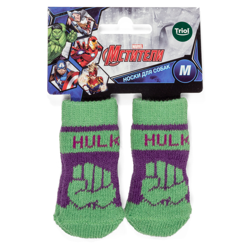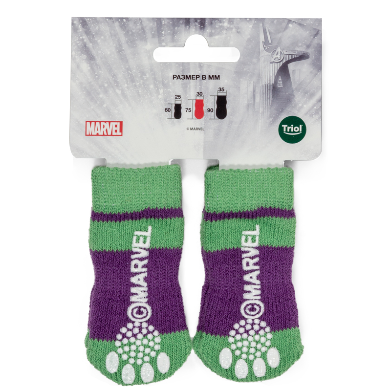 Яркие носочки с изображением Халка - не только стильный, но и полезный аксессуар для вашего питомца. Такие носочки ограждают интерьер от когтей любимца и, благодаря противоскользящему покрытию, позволяют четвероногому питомцу с комфортом передвигаться по паркету, кафелю и другим скользким покрытиям. Теплые, легкие и функциональные, эти носочки также отлично подойдут для согревания лапок питомца в зимний период, если их одеть под ботинки. Цвет: зеленый с фиолетовым. Размеры изделия: 75х30х1мм.