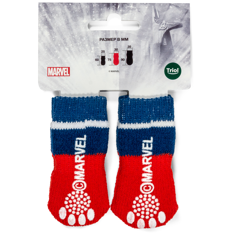 Яркие носочки с изображением логотипа Капитана Америки - не только стильный, но и полезный аксессуар для вашего питомца. Такие носочки ограждают интерьер от когтей любимца и, благодаря противоскользящему покрытию, позволяют четвероногому питомцу с комфортом передвигаться по паркету, кафелю и другим скользким покрытиям. Теплые, легкие и функциональные, эти носочки также отлично подойдут для согревания лапок питомца в зимний период, если их одеть под ботинки. Цвет: красный с синим. Размеры изделия: 75х30х1мм.