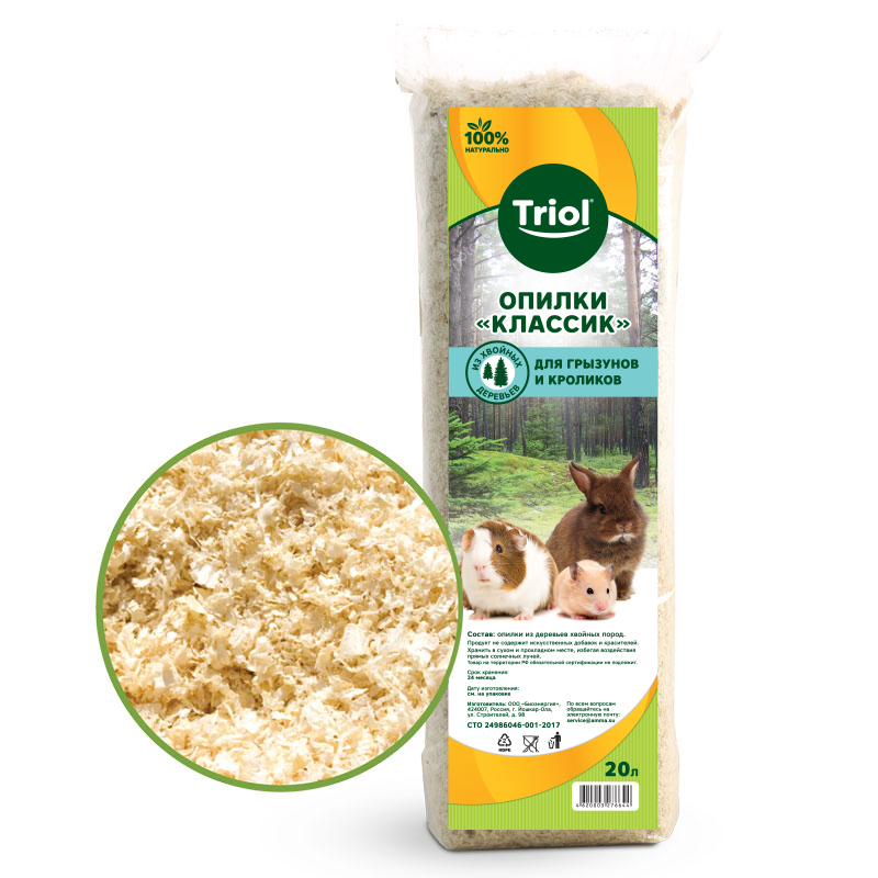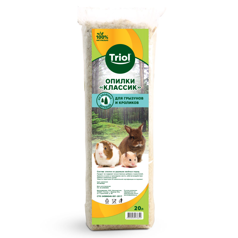 Опилки - натуральный впитывающий гигиенический наполнитель для наполнения поддона клеток грызунов и кроликов. Они представляют собой различного размера стружку лиственных пород деревьев, с присущими ей природными антисептическими свойствами. При производстве опилок Triol используется только первичное сырье. Они обладают повышенной впитываемостью, великолепно удерживают запахи, очищены от пыли, не вызывают аллергии, приятны и безопасны для лап ваших питомцев. Следует менять не реже 1 раза в неделю. Кроме того, опилки Triol являются полностью биоразлагаемым продуктом, не наносящим вред окружающей среде. Объем распакованного продукта не менее 20 литров.
