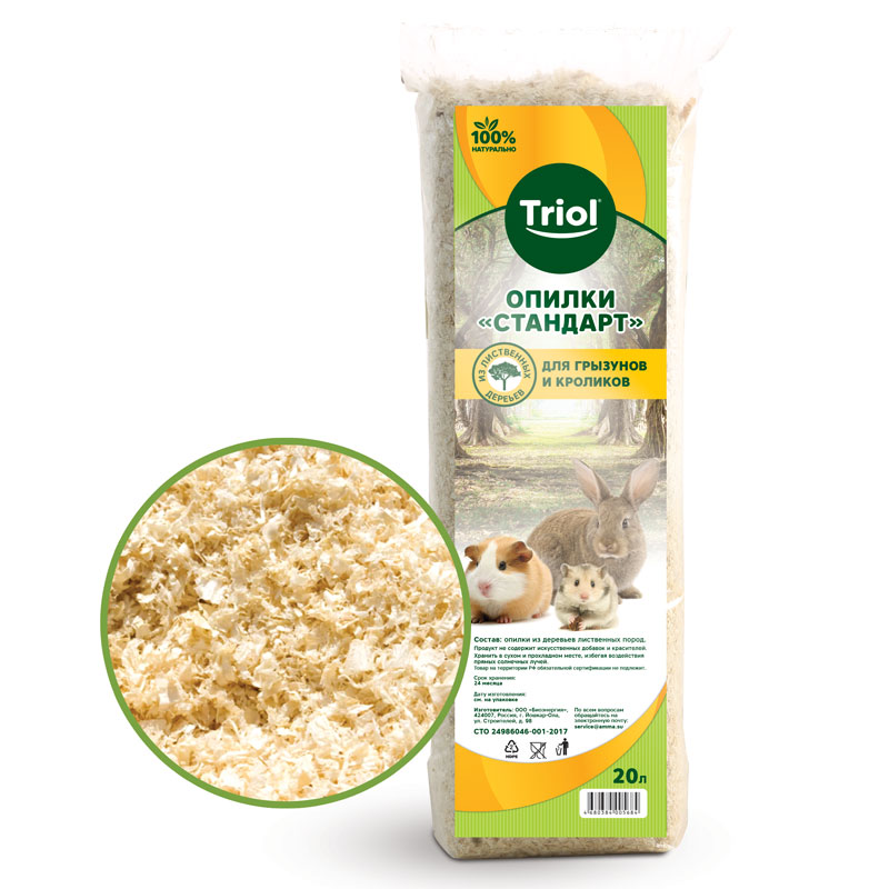 Опилки - натуральный впитывающий гигиенический наполнитель для наполнения поддона клеток грызунов и кроликов. Они представляют собой различного размера стружку лиственных пород деревьев, с присущими ей природными антисептическими свойствами. При производстве опилок Triol используется только первичное сырье. Они обладают повышенной впитываемостью, великолепно удерживают запахи, очищены от пыли, не вызывают аллергии, приятны и безопасны для лап ваших питомцев. Следует менять не реже 1 раза в неделю. Кроме того, опилки Triol являются полностью биоразлагаемым продуктом, не наносящим вред окружающей среде. Объем распакованного продукта не менее 20 литров.