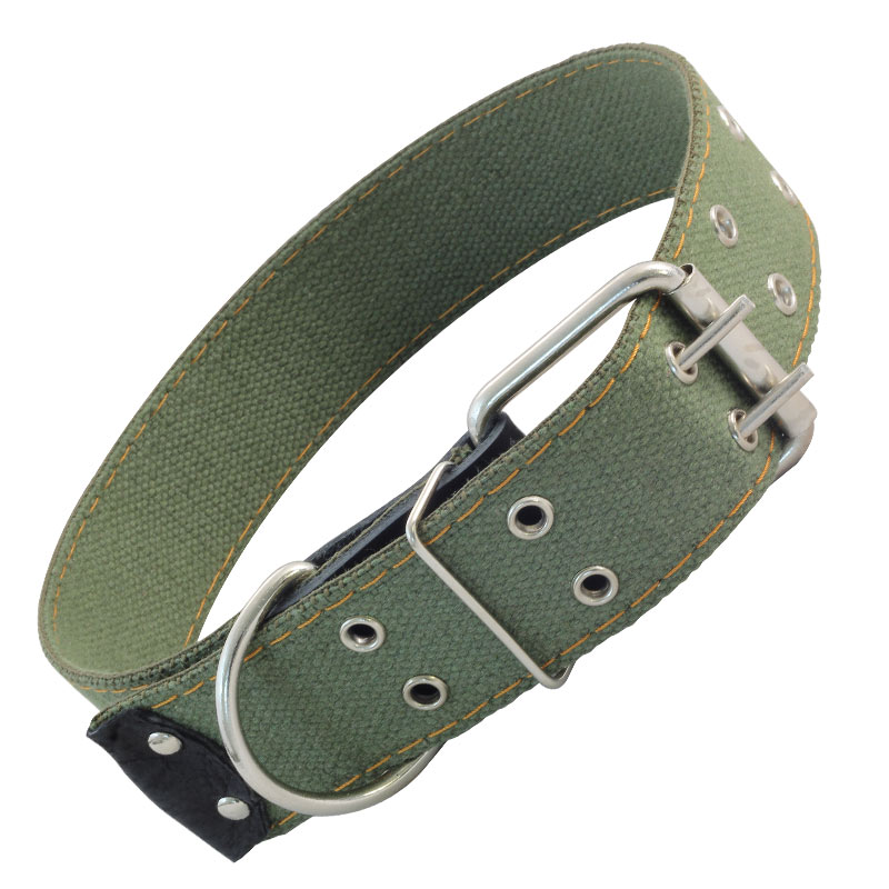 Одинарный прошитый ошейник из брезента с кожаным подпряжником и прочным кольцом для крепления поводка или водилки. Такой ошейник отлично подойдет для собак крупных пород (размеры изделия 740х45 мм). Материал прочный и износостойкий, а длина изделия удобно регулируется. Цвет: хаки.