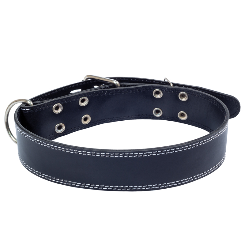 Толстый кожаный ошейник - незаменимый аксессуар для владельцев собак крупных пород. Изделие выполнено из мягкой, но прочной кожи высокого качества с использованием крепкой металлической фурнитуры. Предусмотренные отверстия позволяют удобно подгонять длину под индивидуальные параметры животного, а двойное выносное металлическое кольцо отлично подойдет для надежного крепления карабина поводка, адресника или других аксессуаров. Размеры изделия: 880х45х5мм. Варианты расцветок: бежевый, коньяк, коричневый, черный.