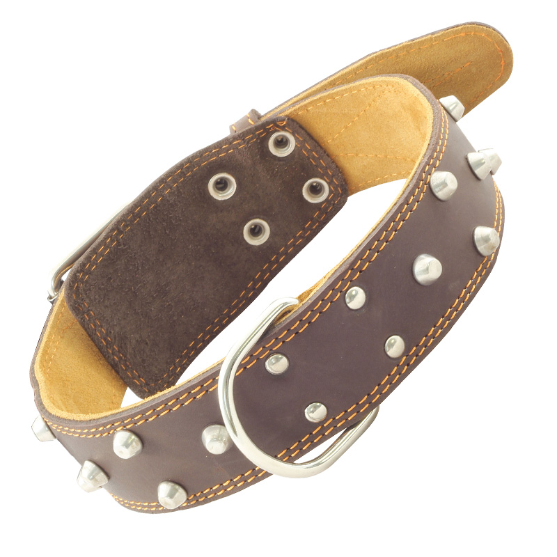 Толстый кожаный ошейник со светоотражателями - универсальный аксессуар для владельцев собак крупных пород. Двойное изделие выполнено из мягкой, но прочной кожи высокого качества с использованием крепкой металлической фурнитуры. Функциональное металлическое кольцо отлично подойдет для крепления карабина поводка, адресника или других аксессуаров, а светоотражающие элементы сделают вашего любимца максимально заметным на дороге в свете фар автомобиля. Размеры изделия: 810х45х4мм. Варианты расцветок: бежевый, коньяк, коричневый, черный.