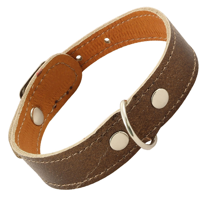 Стильный кожаный ошейник - оригинальный и функциональный аксессуар для небольших собак. Двухслойное изделие выполнено из мягкой, но прочной цветной кожи высокого качества с использованием крепкой металлической фурнитуры. Длину изделия удобно подгонять под индивидуальные параметры животного, а прочное металлическое кольцо ошейника отлично подойдет для крепления поводка, адресника или других аксессуаров. Размер изделия: 300х14х3мм. Варианты расцветок: красный, синий, коричневый, черный.