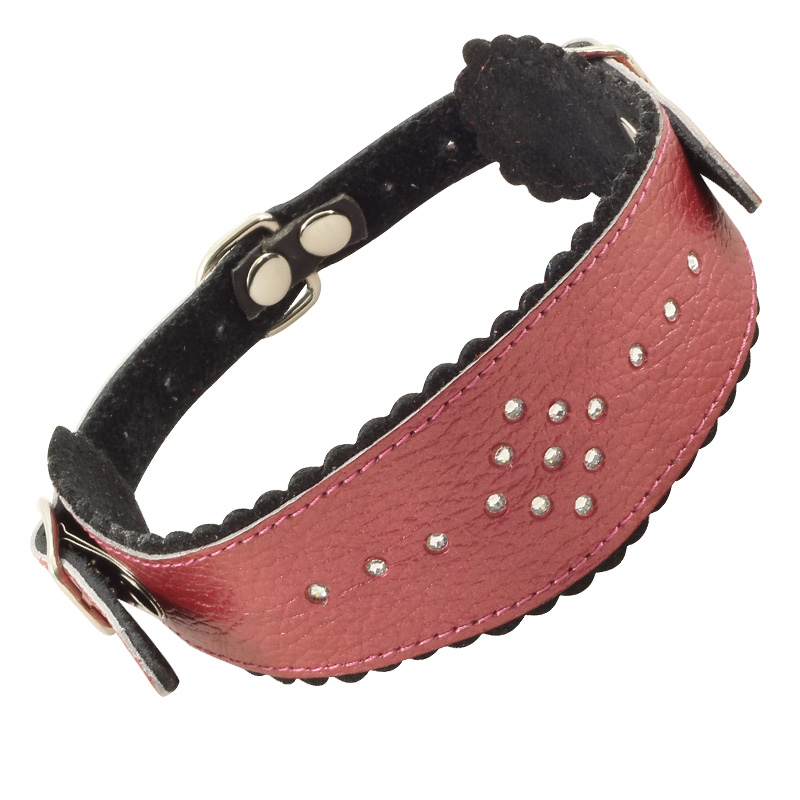 Стильный кожаный ошейник с расширением - незаменимый аксессуар таких пород как такса, ливретка, уиппет и грейхаунд. Такой ошейник не вредит шейным позвонкам, позволяет правильно водить собаку и учит питомца правильно нести голову. Двухслойное изделие выполнено из мягкой, но прочной цветной кожи высокого качества с использованием крепкой металлической фурнитуры и оригинального декора из страз. Длину изделия удобно подгонять под индивидуальные параметры животного, а прочное основание ошейника отлично подойдет для надежного крепления карабина поводка, адресника или других аксессуаров. Размеры изделия: 400х40х3мм. Варианты расцветок: красный, синий, коричневый, черный.