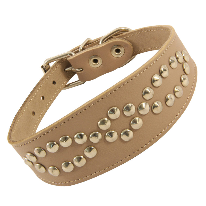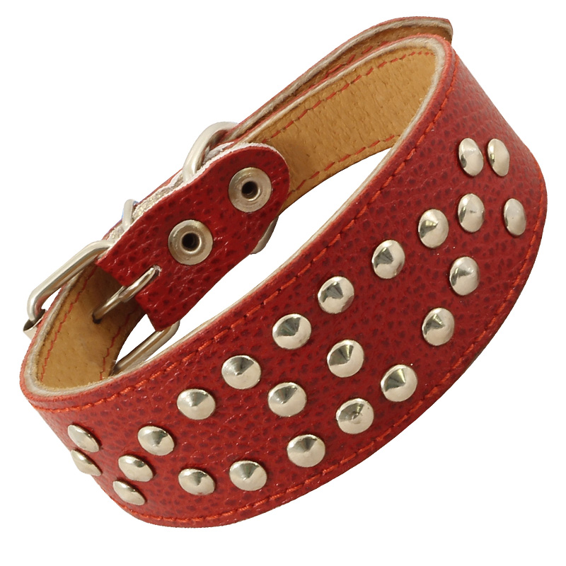 Кожаный ошейник с расширением - незаменимый аксессуар таких пород как такса, ливретка, уиппет и грейхаунд. Такой ошейник не вредит шейным позвонкам, позволяет правильно водить собаку и учит питомца правильно нести голову. Двухслойное изделие выполнено из мягкой, но прочной кожи высокого качества с использованием брутального декора из крепкой металлической фурнитуры. Предусмотренные отверстия позволяют удобно подгонять длину под индивидуальные параметры животного, а выносное металлическое кольцо отлично подойдет для надежного крепления карабина поводка, адресника или других аксессуаров. Размеры изделия: 400х45х3мм. Варианты расцветок: красный, синий, коричневый, бежевый.