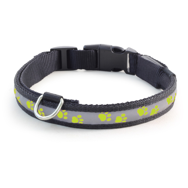 Светодиодный ошейник - это безопасность вашего питомца. Рисунок в виде следов лап. 3 режима свечения и 2 скорости мигания. Видимость в темноте в пределах 500м. Влагостойкая структура контроллера. До 200ч работы. Возможность замены батарейки светодиодного волокна. Цвет салатовый. Размер: 25*310-410мм.