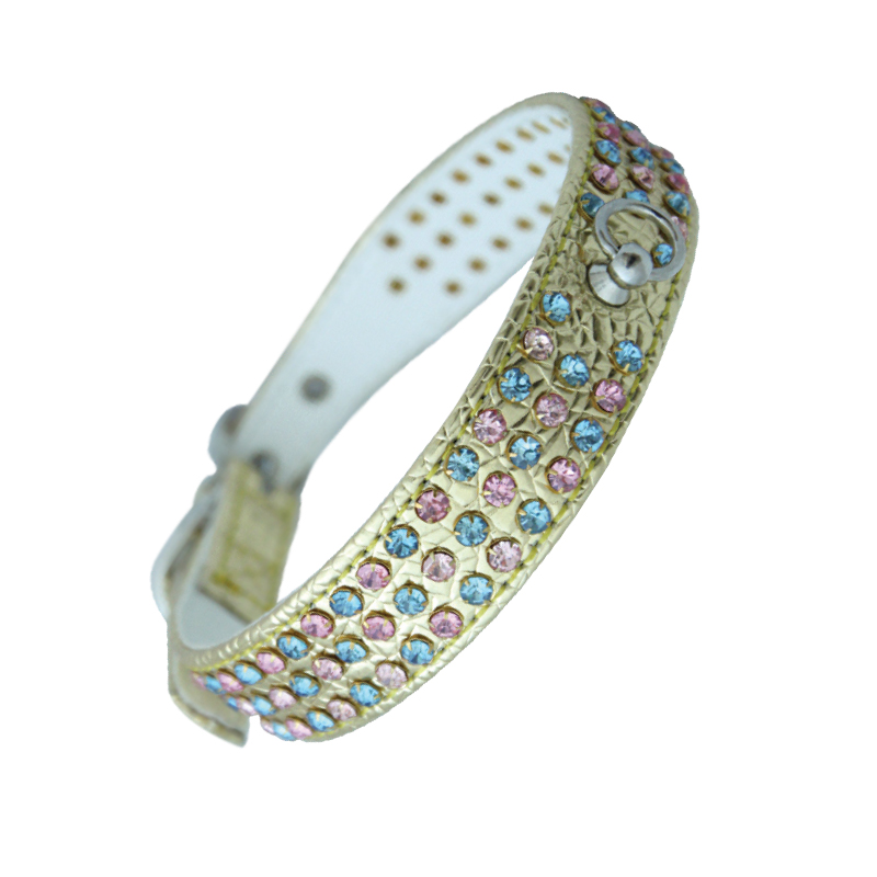 Оригинальный кожаный ошейник со стразами - стильный и функциональный аксессуар для кошек и собак мелких пород. Изделие выполнено из мягкой, но прочной цветной кожи высокого качества с использованием крепкой металлической фурнитуры и изящного декора. Длину изделия удобно подгонять под индивидуальные параметры животного, а прочное основание ошейника отлично подойдет для крепления поводка, адресника или других аксессуаров. Размеры изделия: 25*450мм. Цвет: золотой.