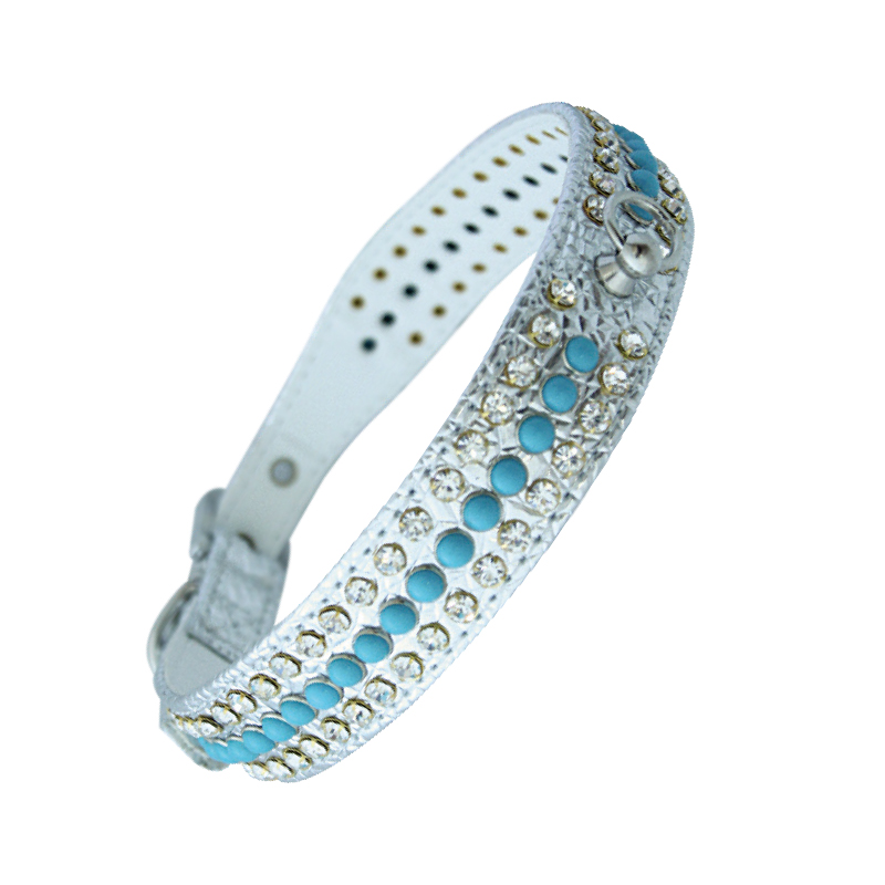 Оригинальный кожаный ошейник со стразами - стильный и функциональный аксессуар для кошек и собак мелких пород. Изделие выполнено из мягкой, но прочной цветной кожи высокого качества с использованием крепкой металлической фурнитуры и изящного декора. Длину изделия удобно подгонять под индивидуальные параметры животного, а прочное основание ошейника отлично подойдет для крепления поводка, адресника или других аксессуаров. Размеры изделия: 25*500мм. Цвет: серебристый.