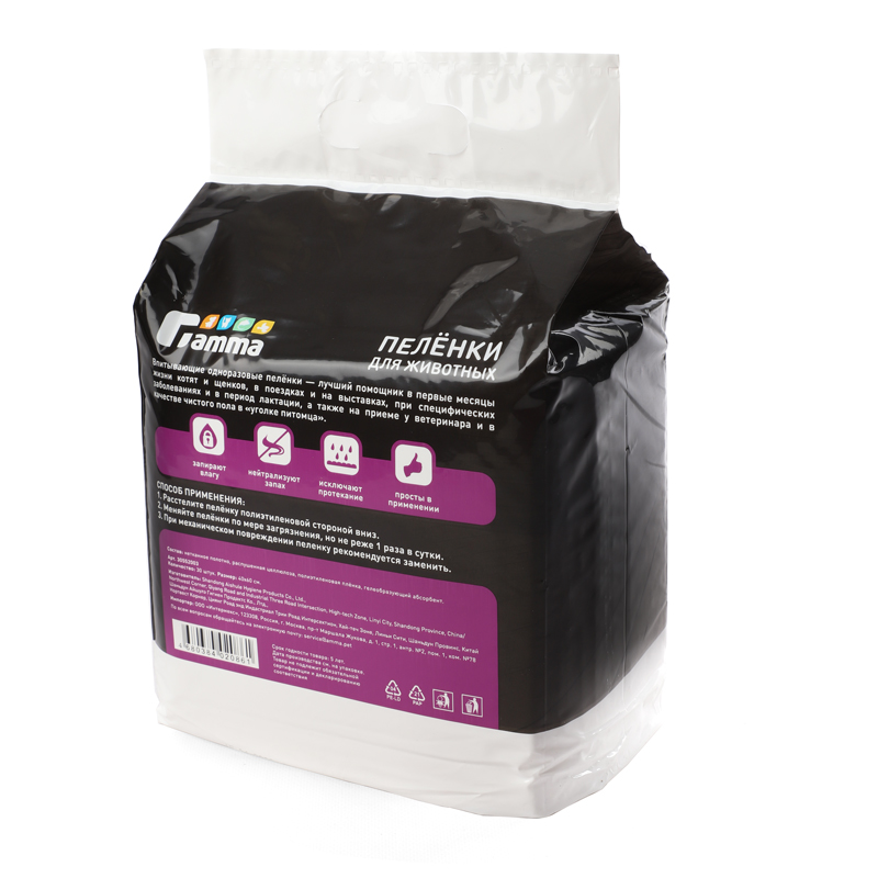 Подстилки впитывающие для домашних животных содержат угольный абсорбент, изготовленный из бамбука, который отлично впитывает жидкость, оставляя поверхность сухой, и надежно удерживает запах. Черный цвет подстилок делает их не только практичным аксессуаром, но и оригинальным дополнением любого интерьера: он отлично скрывает пятна и надолго сохраняет эстетичный внешний вид.