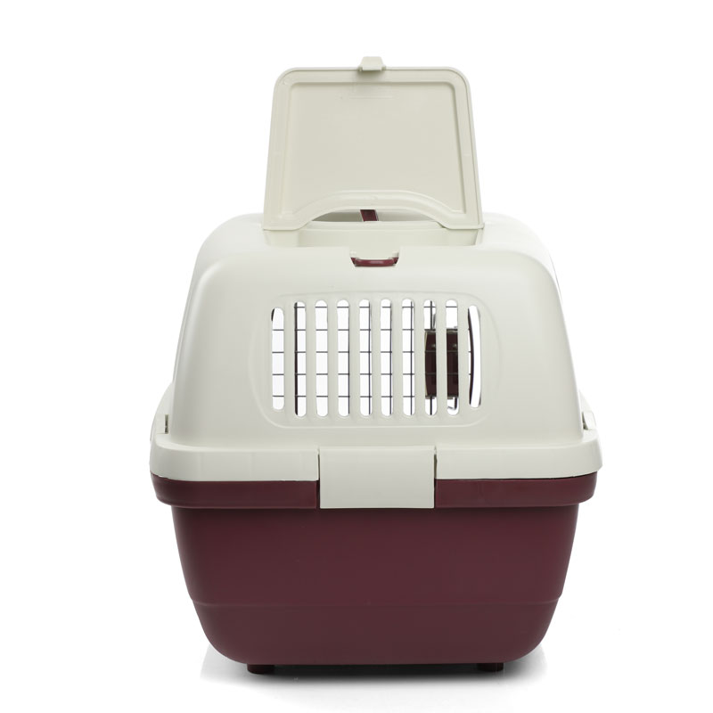 Переноска выполнена из прочного пластика. Оснащена вентиляционными окошками, металлической дверцей, надежным замком и удобной ручкой для транспортировки. На крышке расположены два люка, которые могут использоваться а качестве карманов для сопутствующих предметов или как дополнительная вентиляция. Максимальная нагрузка: 9кг. Цвет: верх - молочный, низ - бургунди. Размер: 620*390*380мм.