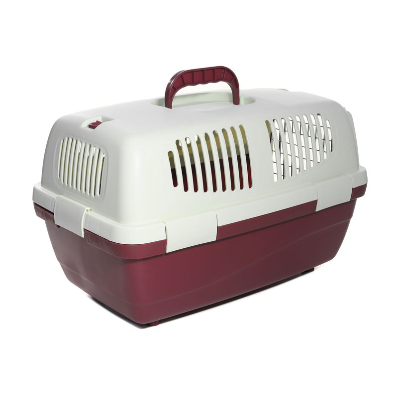 Переноска выполнена из прочного пластика. Оснащена вентиляционными окошками, металлической дверцей, надежным замком и удобной ручкой для транспортировки. На крышке расположены два люка, которые могут использоваться а качестве карманов для сопутствующих предметов или как дополнительная вентиляция. Максимальная нагрузка: 5кг. Цвет: верх - молочный, низ - бургунди. Размер: 560*365*330мм.