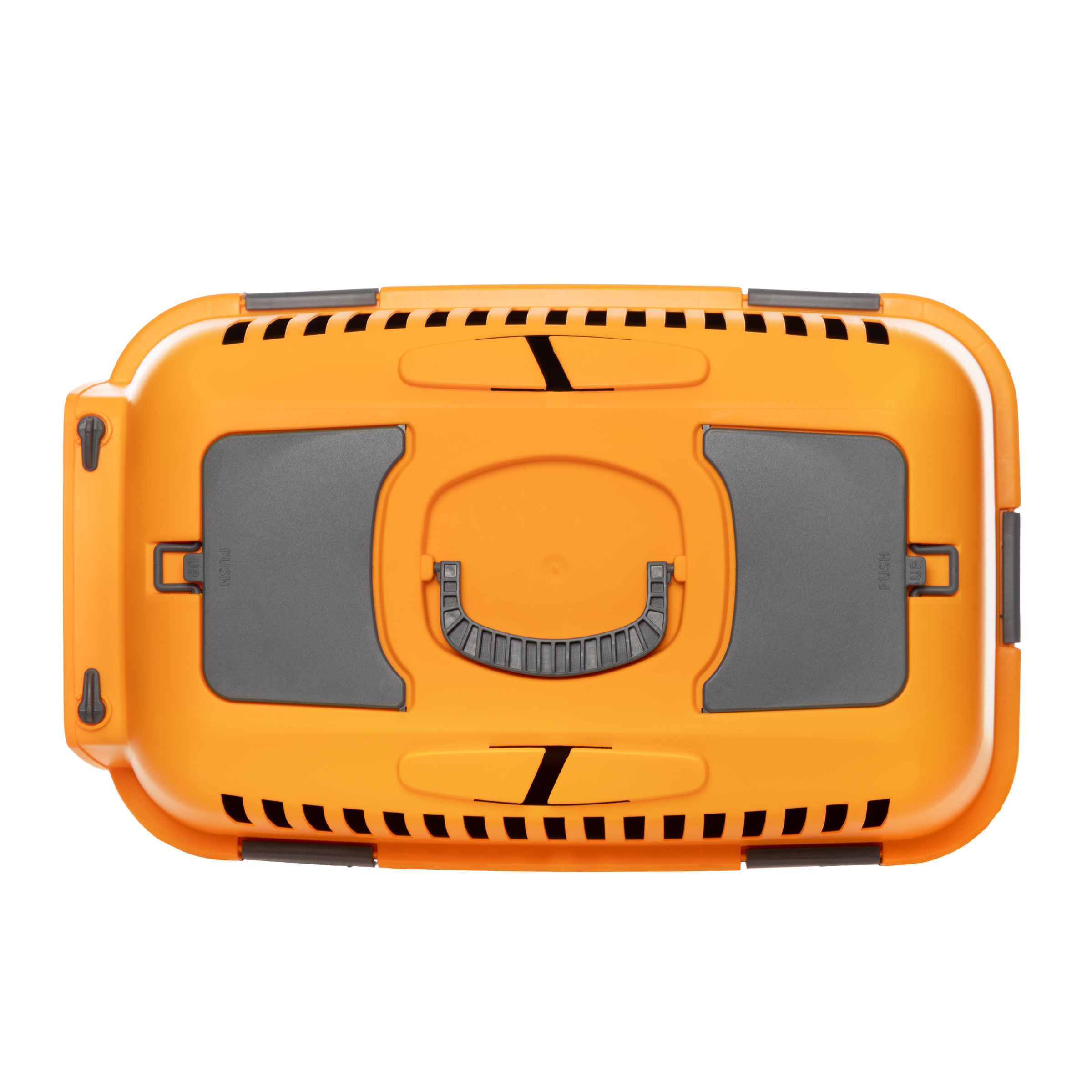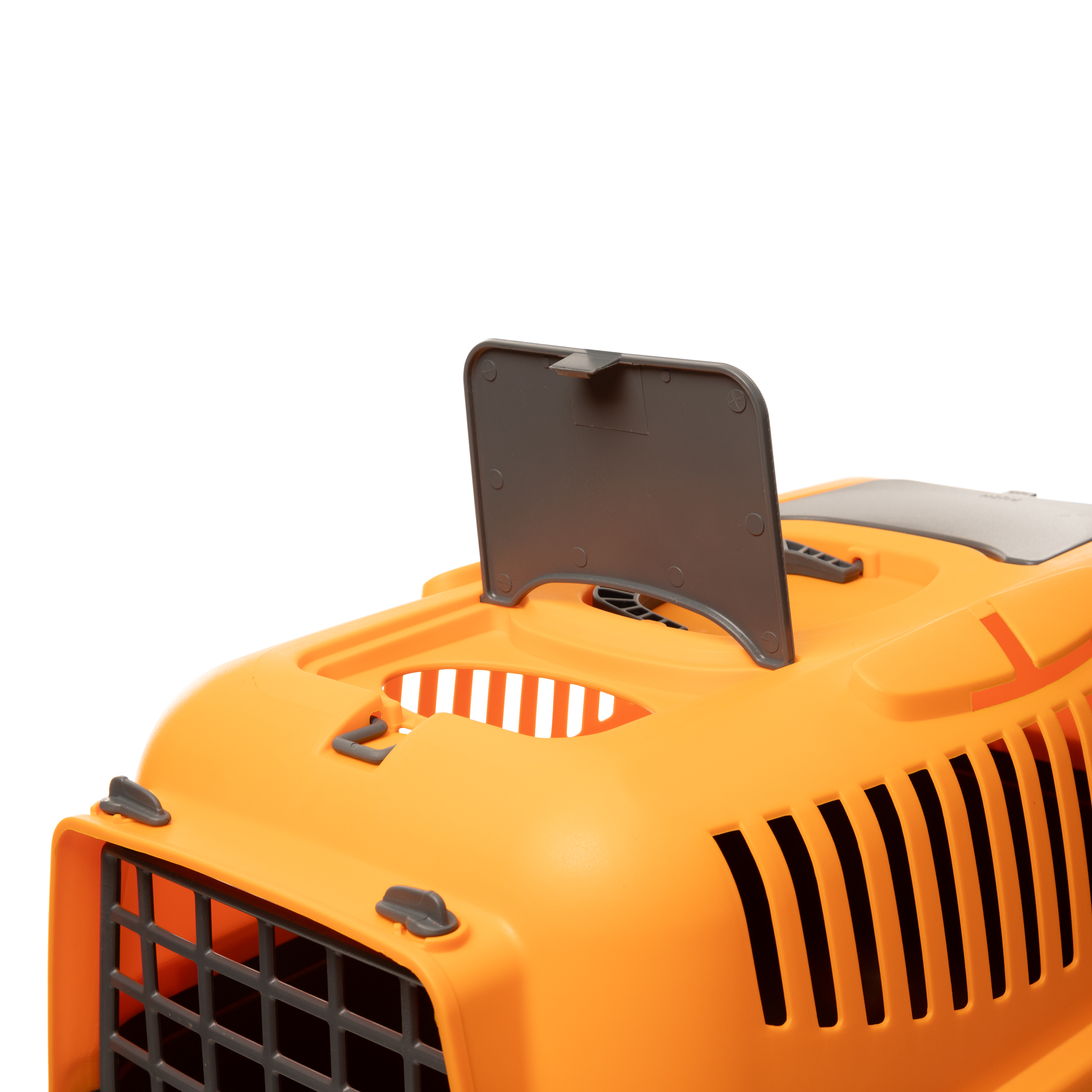 Переноска выполнена из прочного пластика. Оснащена вентиляционными окошками, пластиковой дверцей, надежным замком и удобной ручкой для транспортировки. На крышке расположены два люка, которые могут использоваться а качестве карманов для сопутствующих предметов или как дополнительная вентиляция. Произведена в Сербии. Цвет: оранжевый. Размер: 550x360x350мм. Максимальная нагрузка: 8 кг.