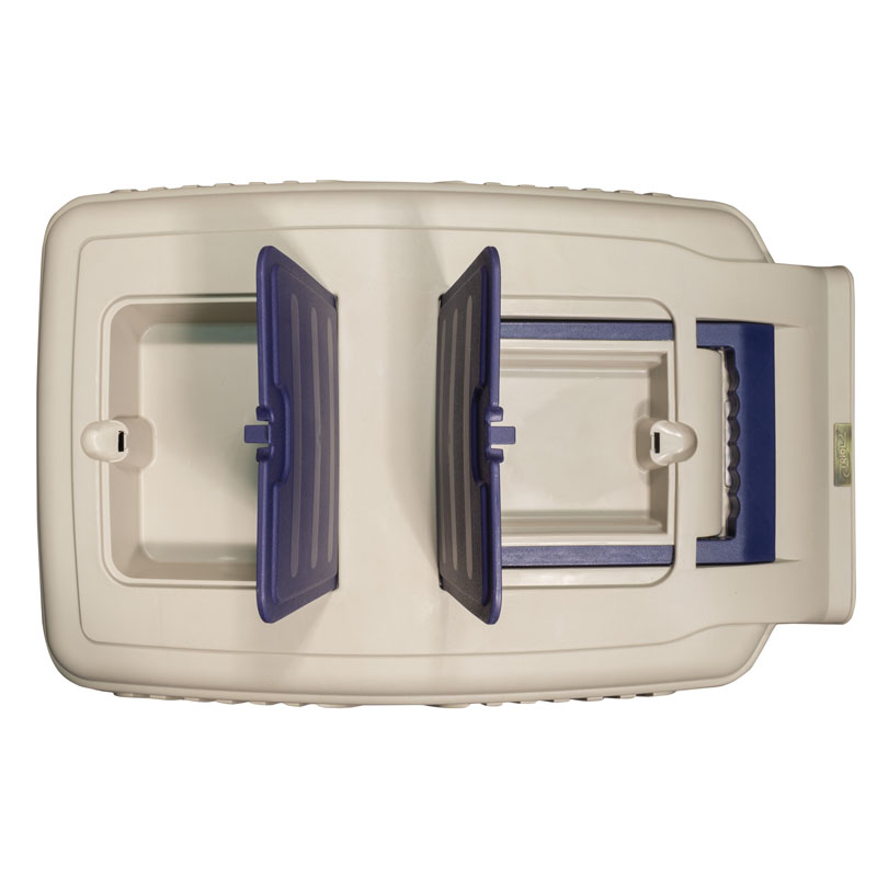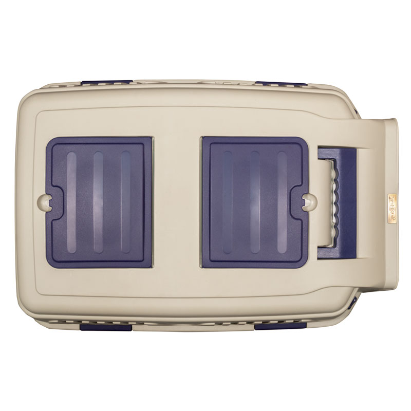 Переноска выполнена из прочного пластика. Оснащена вентиляционными окошками, металлической дверцей, надежным замком и удобной ручкой для транспортировки. На крышке расположены два люка, которые могут использоваться а качестве карманов для сопутствующих предметов или как дополнительная вентиляция. Максимальная нагрузка: 9кг. Цвет: верх - молочный, низ - индиго. Размер: 620*390*380мм.