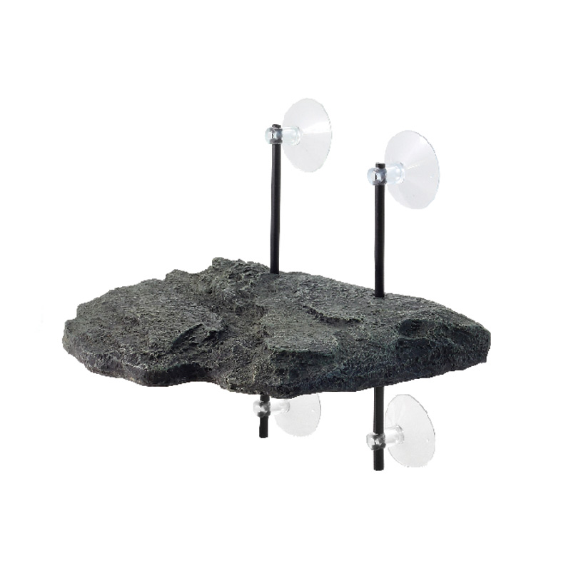 Плавающий плотик для водных черепах. Пластиковые направляющие крепятся к стенкам акватеррариума с помощью присосок, по направляющим свободно перемещается плотик, держащийся на поверхности воды за счет пористой структуры. При оформлении плотика применяется краска, устойчивая к механическому истиранию. Неровная поверхность имитирует скалистый берег.