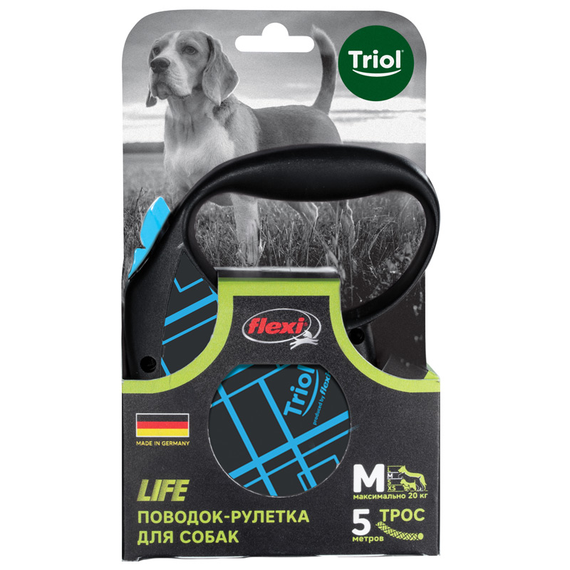 Рулетки для собак flexi – это безусловное качество, подкрепленное многолетним опытом, которое теперь доступно и поклонникам бренда TRIOL. Идеальное исполнение, прочный и, в то же время, приятный на ощупь пластик, запатентованный тормозной механизм и легендарная надежность стали более доступны благодаря сотрудничеству российской компании и немецкого производителя. Рулетки новой коллекции производятся в Германии, собираются вручную и проходят десятки проверок качества перед выпуском с завода. Гарантия производителя составляет два года и предоставляется только на функционирование механизма размотки и не распространяется на повреждения, возникшие в результате укусов собаки или прочего ненадлежащего использования рулетки. Длина троса: 5м. Максимальная нагрузка: 20кг. Цвет рулетки: черный, цвет рисунка: синий.