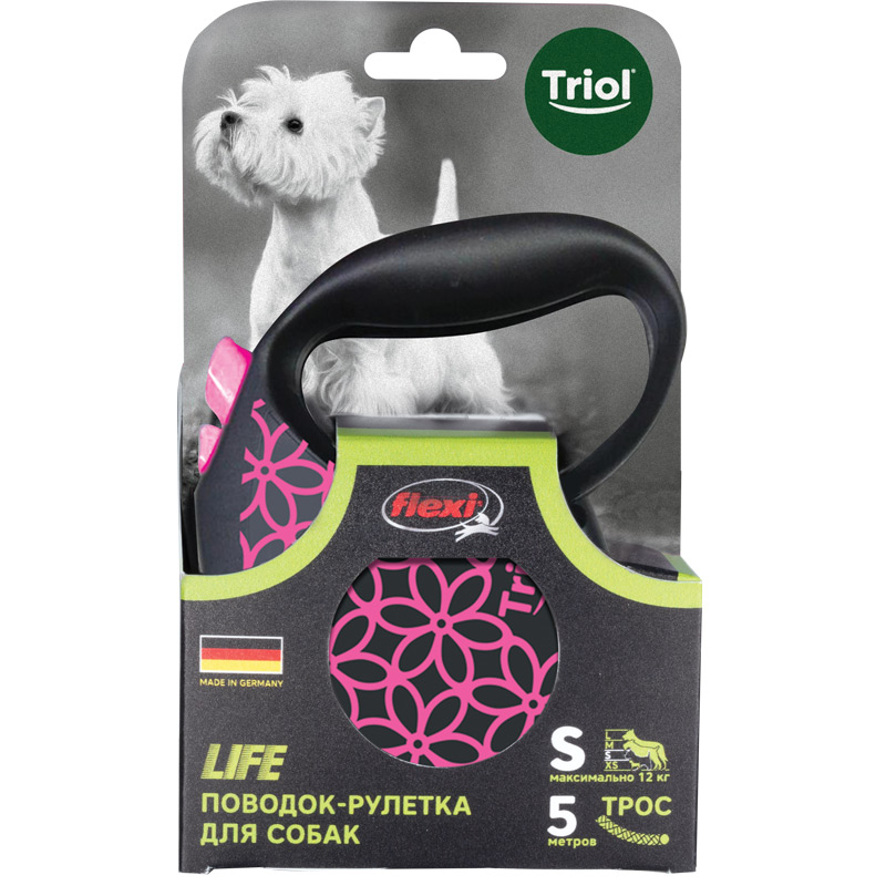 Рулетки для собак flexi – это безусловное качество, подкрепленное многолетним опытом, которое теперь доступно и поклонникам бренда TRIOL. Идеальное исполнение, прочный и, в то же время, приятный на ощупь пластик, запатентованный тормозной механизм и легендарная надежность стали более доступны благодаря сотрудничеству российской компании и немецкого производителя. Рулетки новой коллекции производятся в Германии, собираются вручную и проходят десятки проверок качества перед выпуском с завода. Гарантия производителя составляет два года и предоставляется только на функционирование механизма размотки и не распространяется на повреждения, возникшие в результате укусов собаки или прочего ненадлежащего использования рулетки. Длина троса: 5м. Максимальная нагрузка: 12кг. Цвет рулетки: черный, цвет рисунка: розовый.
