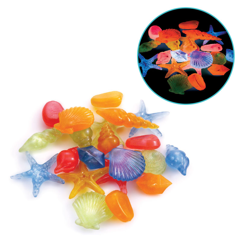 Разноцветные ракушки - декоративный аквариумный грунт, изготовленный из пластика, в состав которого входит люминофор. В течение светового дня люминофор накапливает энергию, которую затем постепенно начинает отдавать в темноте, создавая таинственное свечение. Гранулы выполнены в виде различных ракушек, камешков, морских звезд. Безвреден для обитателей аквариума, подходит для пресной воды, может применяться в ландшафтном, флористическом и аквариумном дизайне. В упаковке 100 штук.