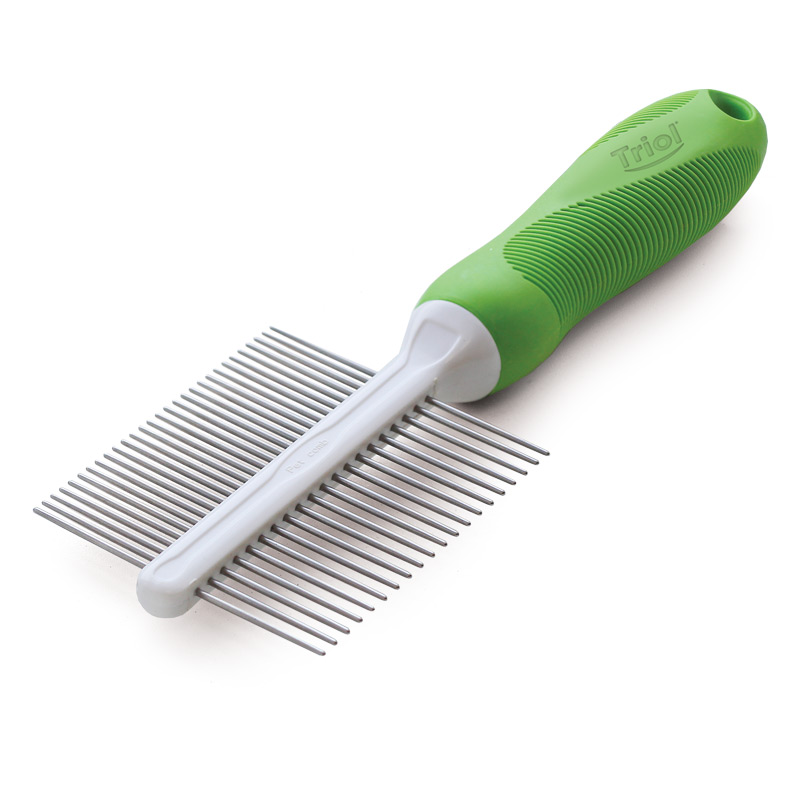 Расческа-грабли для животных TRIOL™ идеально подходит для питомцев с густой длинной шерстью, склонной к образованию колтунов. Изделие используется для удаления уже выпавших волос и уменьшения линьки. Благодаря вращающимся зубцам расческа лучше скользит по шерсти, что делает расчесывание максимально безболезненным и эффективным. Закругленные концы зубцов бережно воздействуют на кожу животного и создают дополнительный массажный эффект. Изделие имеет 20 зубцов одинаковой длины и удобную прорезиненную ручку. Изделие упаковано в блистер. Размер изделия: 165х115х60мм.