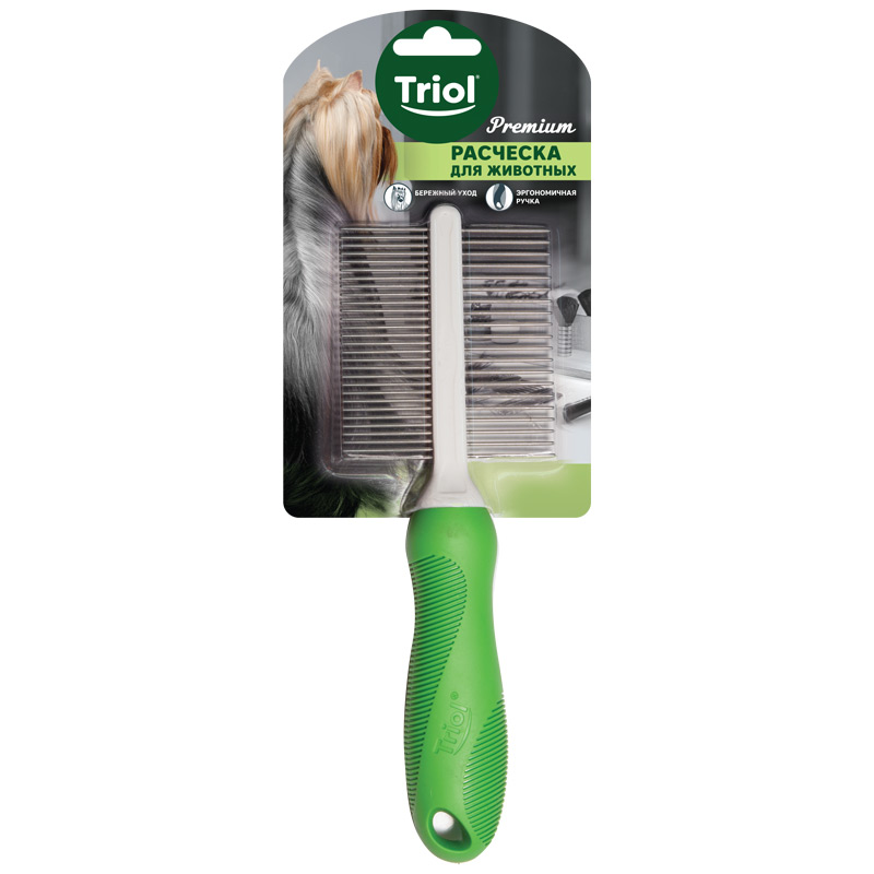 Расческа для животных TRIOL™ идеально подходит для удаления уже выпавших волос и уменьшения линьки. Благодаря вращающимся зубцам расческа лучше скользит по шерсти, что делает расчесывание максимально безболезненным и эффективным. Закругленные концы зубцов бережно воздействуют на кожу животного и создают дополнительный массажный эффект. Изделие имеет 35 металлических зубцов одинаковой длины и удобную прорезиненную ручку. Изделие упаковано в блистер. Размер изделия: 210х53х25мм.
