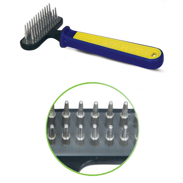 Расческа-грабли для животных TRIOL™ идеально подходит для питомцев с густой длинной шерстью, склонной к образованию колтунов. Изделие используется для удаления уже выпавших волос и уменьшения линьки. Благодаря вращающимся зубцам расческа лучше скользит по шерсти, что делает расчесывание максимально безболезненным и эффективным. Закругленные концы зубцов бережно воздействуют на кожу животного и создают дополнительный массажный эффект. Изделие имеет 20 зубцов одинаковой длины и удобную прорезиненную ручку. Изделие упаковано в блистер. Размер изделия: 165х115х60мм.