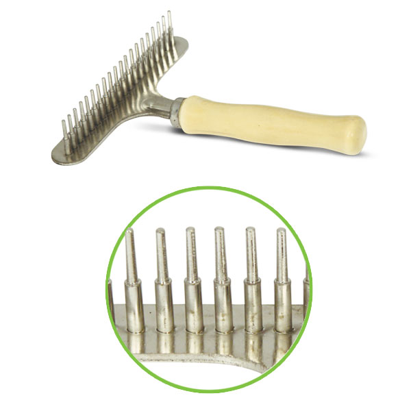 Расческа-грабли с удобной деревянной ручкой и 20 металлическими зубцами. Изделие предназначено для мягкого расчёсывания шерсти пушистого питомца. Проволочные зубчики позволяют проводить расчёсывание аккуратно, без раздражения кожного покрова животного, доставляя ему большое удовольствие. Упаковка - подложка. Каждое изделие упаковано в полиэтиленовый пакет. Размер 135х110х35мм.