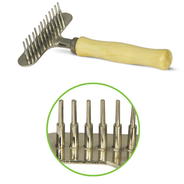 Расческа-грабли с удобной деревянной ручкой и 13 крупными металлическими зубцами. Изделие предназначено для мягкого расчёсывания шерсти пушистого питомца. Проволочные зубчики позволяют проводить расчёсывание аккуратно, без раздражения кожного покрова животного, доставляя ему большое удовольствие. Упаковка - подложка. Каждое изделие упаковано в полиэтиленовый пакет. Размер 140х80х23мм.