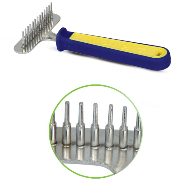 Расческа-грабли для животных TRIOL™ идеально подходит для питомцев с густой длинной шерстью, склонной к образованию колтунов. Изделие используется для удаления уже выпавших волос и уменьшения линьки. Благодаря вращающимся зубцам расческа лучше скользит по шерсти, что делает расчесывание максимально безболезненным и эффективным. Закругленные концы зубцов бережно воздействуют на кожу животного и создают дополнительный массажный эффект. Изделие имеет 20 зубцов одинаковой длины и удобную прорезиненную ручку. Изделие упаковано в блистер. Размер изделия: 165х115х60мм.