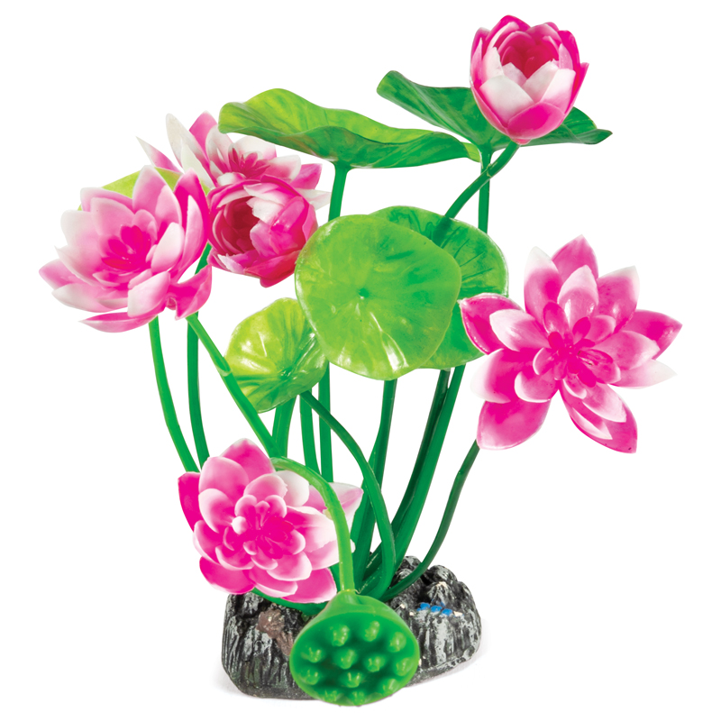 Растения - это не только завершающий штрих в оформлении, но и необходимый атрибут любого аквариума. Они придают трехмерность внутреннему пространству аквариума, а также служат дополнительным укрытием для небольших рыб, отвечая тем самым не только за эстетику, но и принося обитателям аквариума реальную пользу. Неоспоримое преимущество искусственных растений в том, что в них не заводятся паразиты и грибки, их легко мыть и дезинфицировать, и прослужат они неизмеримо дольше, чем живые растения. Изготовленное из нетоксичного пластика, растение для аквариума с тяжелой керамической подставкой "Нимфея розовая" подойдет для оформления любых типов пресноводных аквариумов.