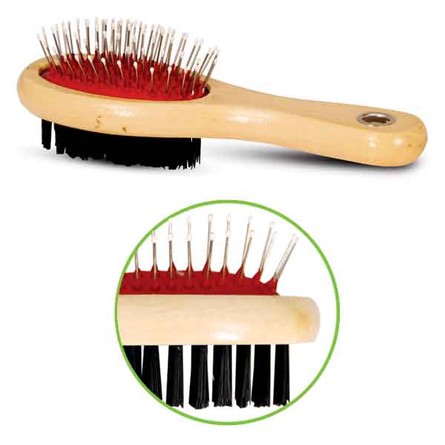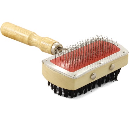 Удобная двустороняя щетка прямоугольной формы с деревянной ручкой обеспечивает нежный уход за верхним и базовым слоем шерсти животного. Нейлоновая щетина с одной стороны и металлическая с наконечниками с другой идеально подходят для питомцев с любым типом шерсти. Размер изделия: 170х65х45мм. Упаковка: блистер.