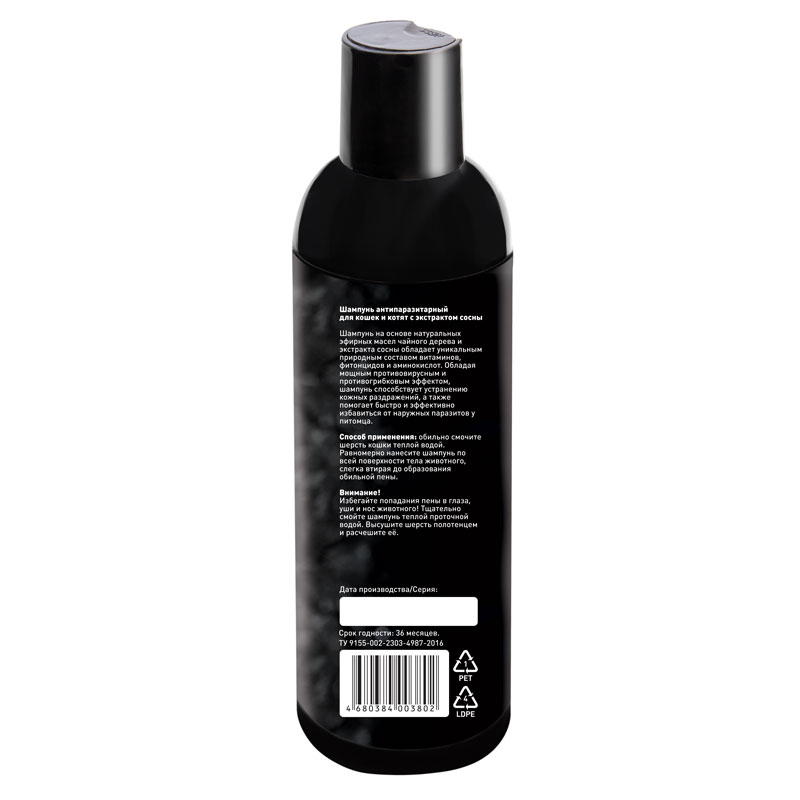 Шампунь для кошек и котят против внешних паразитов на основе натуральных эфирных масел ромашки, чайного дерева и герани. Смесь природных репеллентов помогает быстро избавиться от уже «живущих» на питомце паразитов и эффективно защищает от нападения новых, образуя естественную защиту после купания. Состав подходит для борьбы с клещами, блохами, власоедами, вшами и другими наружными паразитами. Шампунь обладает мягким дезодорирующим эффектом и оставляет после себя приятный свежий аромат.