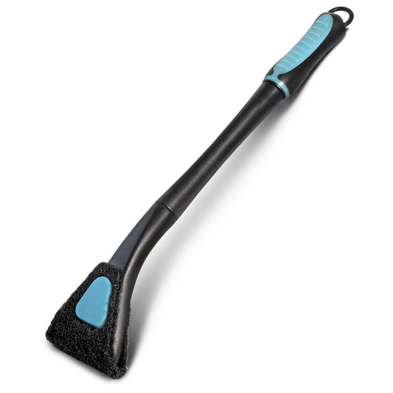 Двусторонний скребок для аквариума на длинной ручке с подвижной головкой. Очистка поверхности производится с помощью полосы жесткого нетканого материала с одной стороны и пластикового лезвия с другой.
