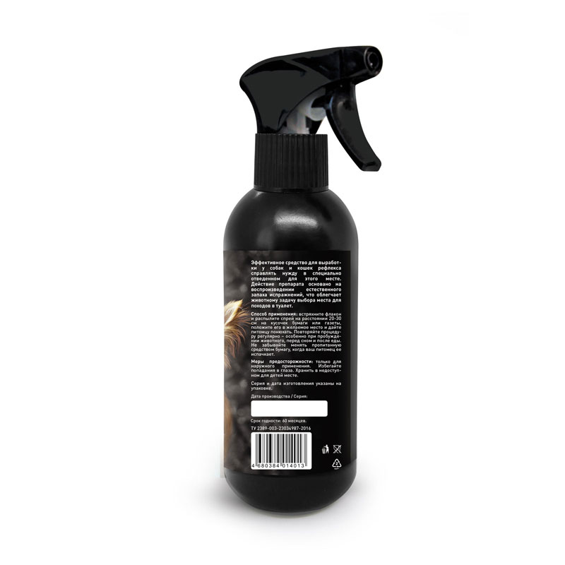 Спрей зоогигиенический предназначен для привлечения внимания собаки или кошек к определенному месту с целью справления нужды. Бесцветная прозрачная жидкость со специфическим запахом во флаконе с триггером.