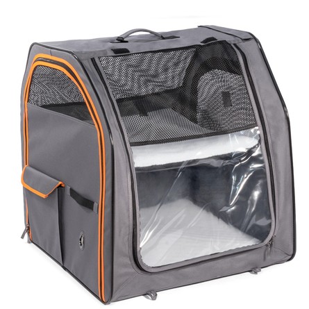 Легкая, вместительная и эргономичная сумка-переноска для домашних животных. Пластиковый каркас обеспечивает сохранность формы сумки-переноски в собранном виде. Изделие имеет удобную ручку с резиновой накладкой. Дополнительная опция сумки-переноски - откидывание боковых сторон. Размеры сумки 240*430*240мм. Цвет: черно-серо-оранжевый