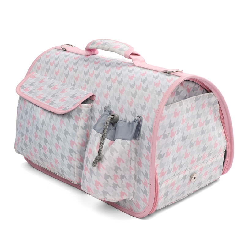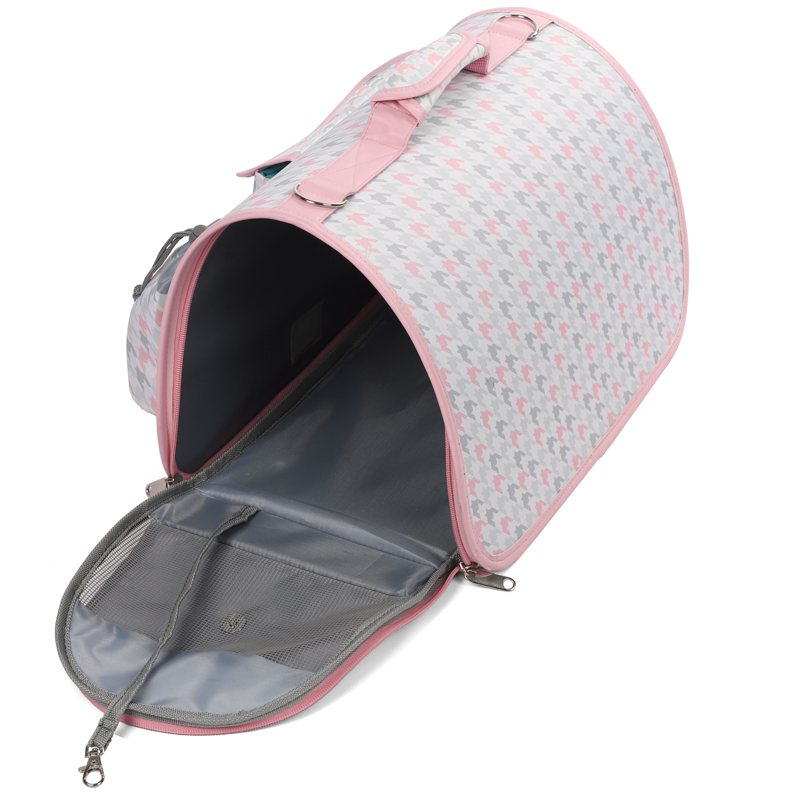 Удобная переноска для транспортивки кошек и собак небольших пород. У переноски жесткое основание - она надежная, прочная и удобно встает на сиденье. Ручки по периметру переноски позволяют комфортно нести сумку в руке или на плече. Для удобства перевозки питомца предусмотрены карманы для дополнительных аксессуаров, а торцевые стенки на молнии открываются легким движением. Цвет: белый с розовым и серым принтом. Размер: 430х240х250мм. Максимальная нагрузка: 7 кг.