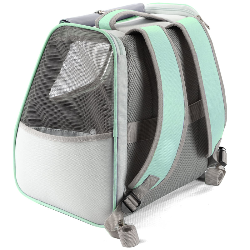 Для владельца предусмотрены удобные широкие лямки с регулировкой, а также отдельная ручка сверху для подвешивания или переноски питомца в руке. Задняя стенка и лямки рюкзака выполнены из сетчатой ткани для дополнительной вентиляции спины владельца. Также в сумке-рюкзаке предусмотрена специальное крепление для ручки чемодана. Для быстрого доступа к питомцу предусмотрено 3 отверстия на молнии – переднее окошка и две боковые сетчатые вставки.