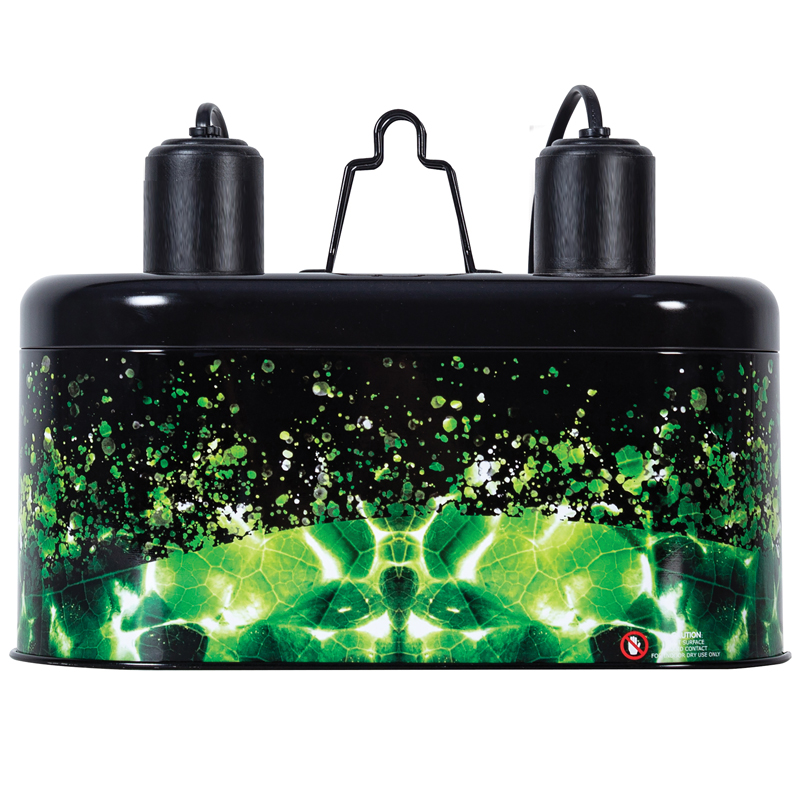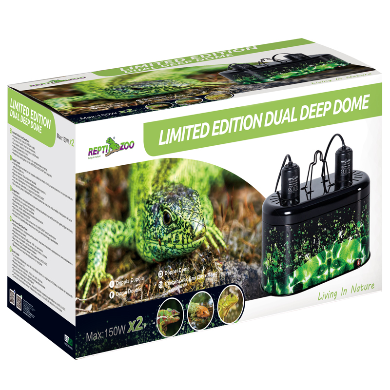 Светильник представляет собой рефлектор с оптическим отражателем, который изготовлен из высококачественного алюминия, нанесенного слоем 0,8 мм и имеющим идеально гладкую поверхность. Рефлектор оборудован двумя керамическими цоколями Е27, что позволяет устанавливать в них любые необходимые лампы: накаливания, галогеновые, спиральные люминесцентные. Светильники Repti-Zoo серии DRL можно использовать в террариумах с различными видами рептилий. Для удобства включения/выключения оба сетевых шнура оснащены выключателями. Максимальная нагрузка на один цоколь - 150 Вт. Благодаря нанесенному на купол рисунку, эта модель светильника гармонично впишется в тропический террариум.