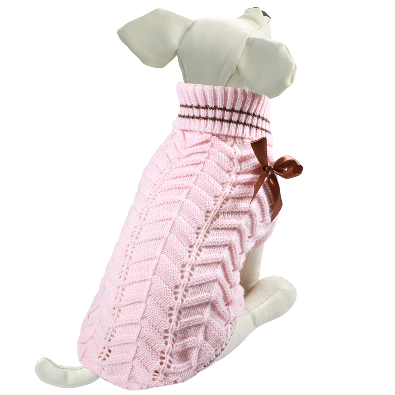 Свитер нежной расцветки и оригинальной вязки с украшением в виде банта - это удобный и функциональный аксессуар для собак, который просто незаменим в холодную погоду. Изделие защитит вашего питомца от ветра и согреет в непогоду, а универсальный фасон не будет стеснять движений питомца во время прогулки. Свитер прекрасно сидит на животном благодаря специальным лямочкам для задних лап, и манжетам для передних. Такой свитер со стильным дизайном станет украшением гардероба вашего питомца. Материал: акрил. Цвет: розовый. Размер: 40см (XL).