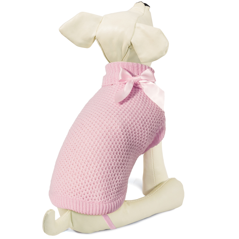 Свитер нежной расцветки и оригинальной вязки с украшением в виде банта - это удобный и функциональный аксессуар для собак, который просто незаменим в холодную погоду. Изделие защитит вашего питомца от ветра и согреет в непогоду, а универсальный фасон не будет стеснять движений питомца во время прогулки. Свитер прекрасно сидит на животном благодаря специальным лямочкам для задних лап, и манжетам для передних. Такой свитер со стильным дизайном станет украшением гардероба вашего питомца. Материал: акрил. Цвет: розовый. Размер: 20см (XS).