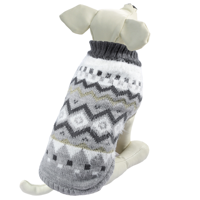 Теплый свитер с узором в виде ромбов - это удобный и функциональный аксессуар для собак, который просто незаменим в холодную погоду. Изделие защитит вашего питомца от ветра и согреет в непогоду. Свитер имеет стильный дизайн, украшением которого служат узоры из золотых нитей, а универсальный и продуманный до мелочей фасон не стесняет движений питомца во время прогулки. Такой свитер с оригинальным узором станет украшением гардероба вашего питомца. Материал: акрил. Цвет: серый. Размер: 30см (M).