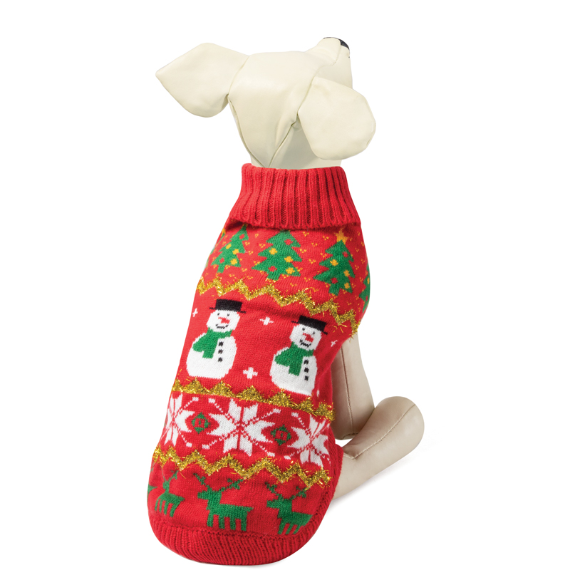 Свитер "Снеговик" подарит вам и вашему любимому питомцу новогоднее настроение, порадует окружающих. Свитер украшен золотыми нитями и рисунками елочек и снеговиков на спинке. Изделие защитит вашего питомца от ветра и согреет в непогоду: спинка утеплена вторым слоем пряжи. Свитер легко надевается и снимается, прекрасно сидит на животном благодаря вязаной резинке, идущей по краю спинки, а универсальный фасон не стесняет движений питомца во время прогулки.