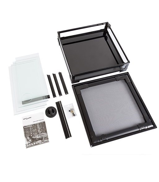 Мини-террариумы из силикатного стекла подходят для содержания насекомых, членистоногих, амфибий и молодняка рептилий. Верхняя металлическая сетка с механическим замком используется в качестве дверцы. С помощью направляющих в верхней и нижней части несколько мини-террариумов можно поставить один на другой.