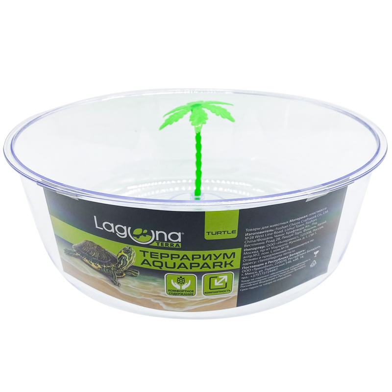 Легкий и удобный пластиковый террариум используется для содержания маленьких красноухих черепах. Террариум имеет круглую форму. В центре - небольшой островок с пальмой для отдыха черепах. Пластиковые детали террариума легко моются и дезинфицируются. Цвет: прозрачный. Размер: d220*80мм.