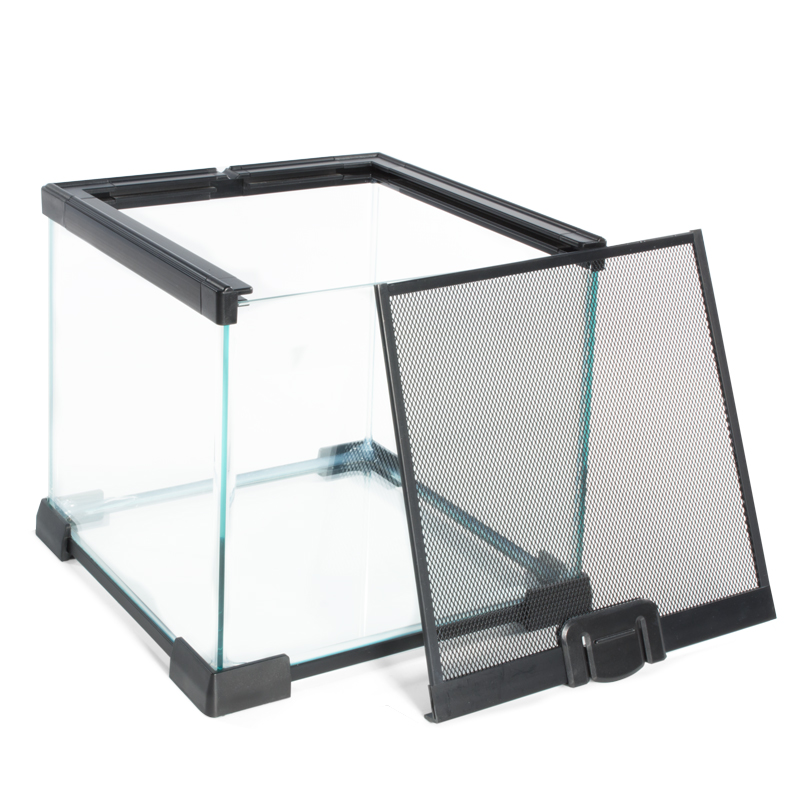 Мини-террариумы из силикатного стекла подходят для содержания насекомых, членистоногих, амфибий и молодняка рептилий. Верхняя металлическая сетка с механическим замком используется в качестве дверцы. С помощью направляющих в верхней и нижней части несколько мини-террариумов можно поставить один на другой.