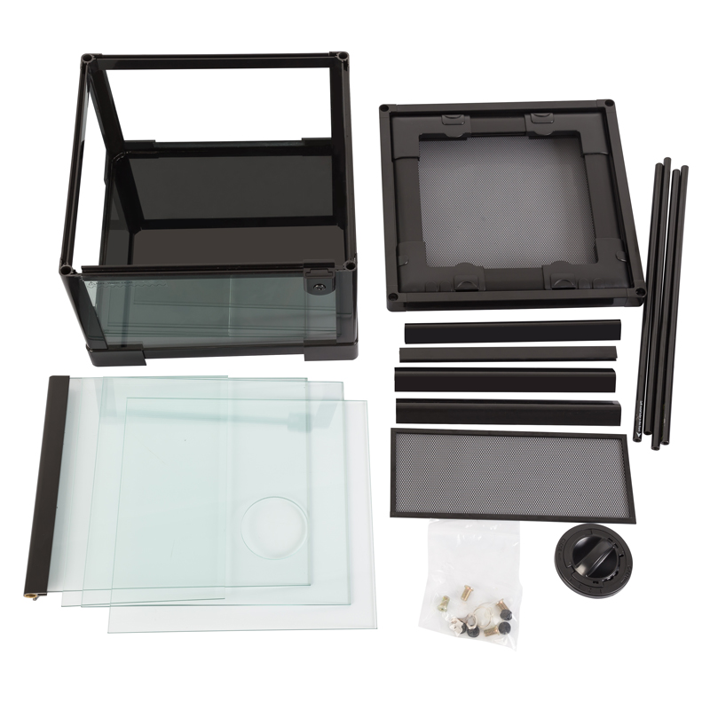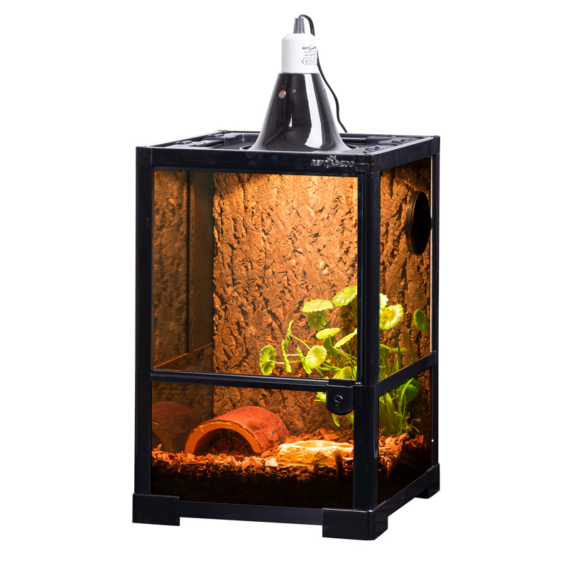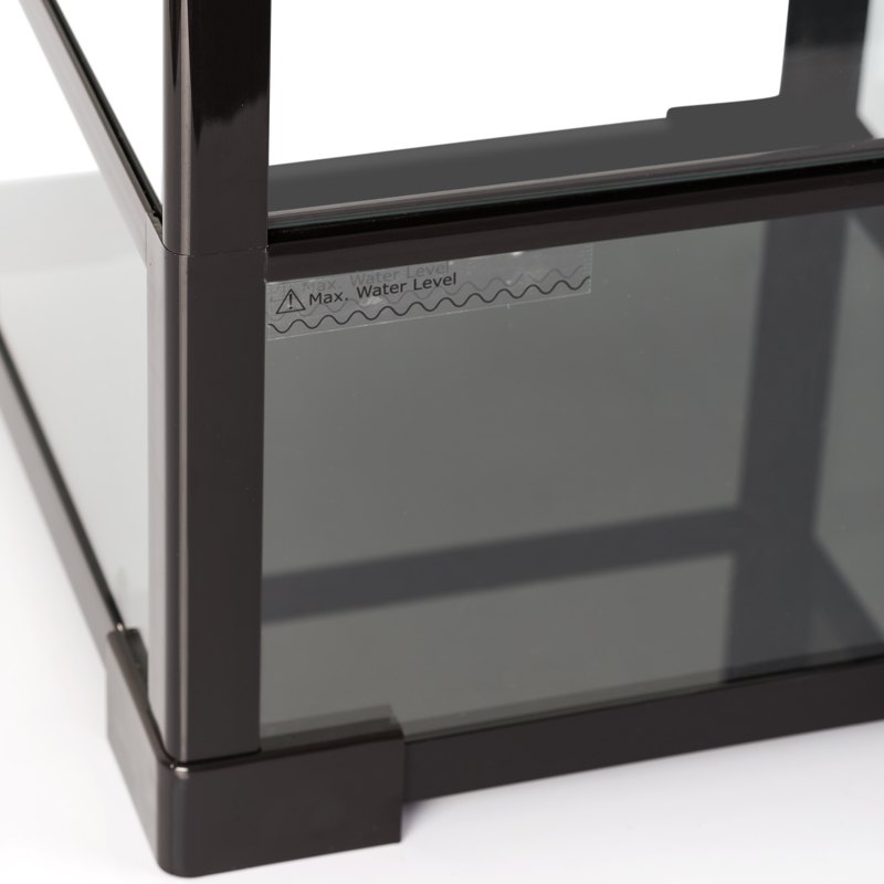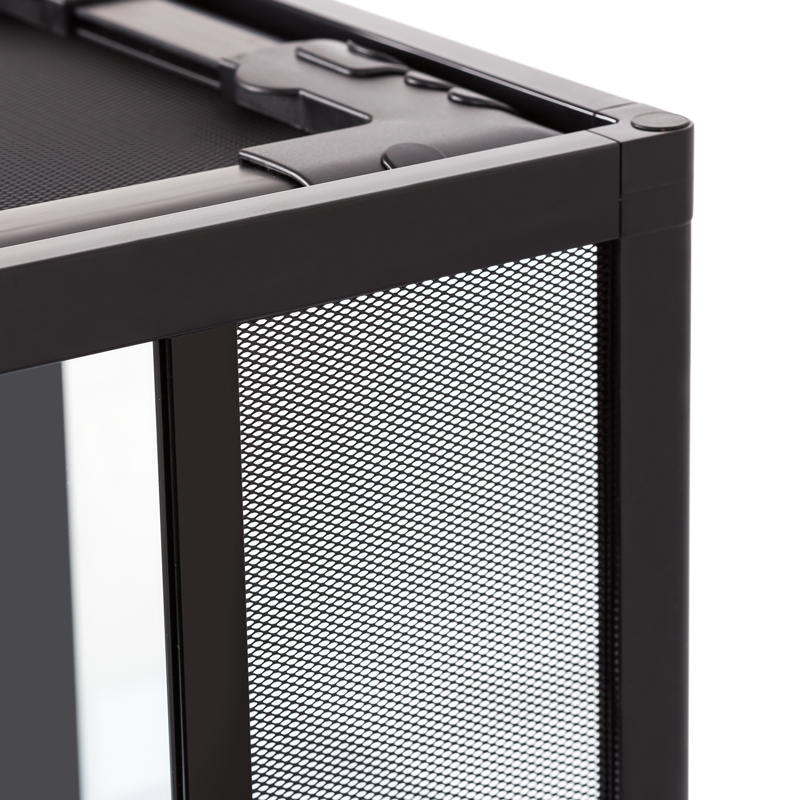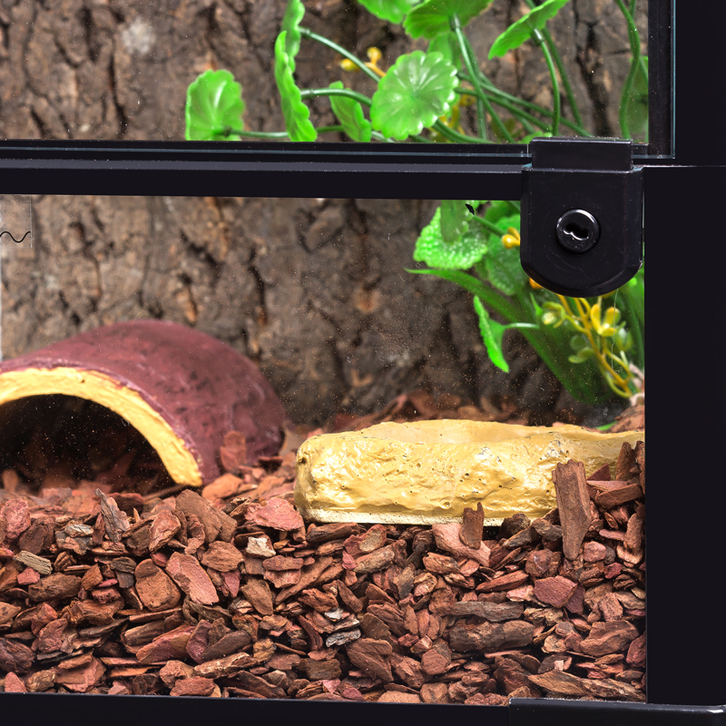 Мини-террариумы из силикатного стекла подходят для содержания насекомых, членистоногих, амфибий и молодняка рептилий. Верхняя металлическая сетка с механическим замком используется в качестве дверцы. С помощью направляющих в верхней и нижней части несколько мини-террариумов можно поставить один на другой.