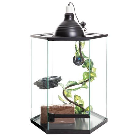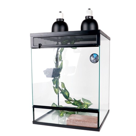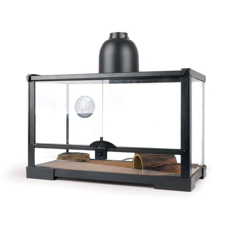 Террариум с наполнением включает в себя все, что необходимо для содержания животных. Основа комплекта – террариум из силикатного стекла со съемной крышкой, выполненной из металлической сетки с пластиковой рамкой. Также в комплект входят металлический светильник с керамическим цоколем, нагрузка на светильник до 150Вт, греющий коврик малой мощности, который можно разместить на нижнюю или боковую поверхность террариума (с внешней стороны), термогигрометр, коврик-субстрат, поилка и укрытие. Террариумный набор предназначен для комфортного содержания эублефаров, наземных лягушек и мелких жаб, кивсяков, некрупных змей и наземных ящериц небольшого размера. Размер: 514*260*304мм