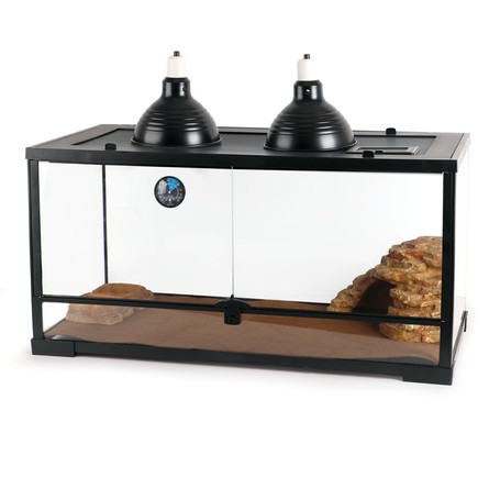 Террариум с наполнением включает в себя все, что необходимо для содержания животных. Основа комплекта – террариум из силикатного стекла со съемной крышкой, выполненной из металлической сетки с пластиковой рамкой. Также в комплекте два металлических светильника с керамическим цоколем, нагрузка на каждый светильник до 150Вт, термогигрометр, коврик-субстрат, кормушка, поилка и укрытие. Террариумный набор предназначен для комфортного содержания бородатых агам, плащеносных ящериц, черно-белых тегу, небольших варанов, синеязыких сцинков и других крупных наземных ящериц, королевских питонов, наземных лягушек и жаб. Размер: 914*457*457мм