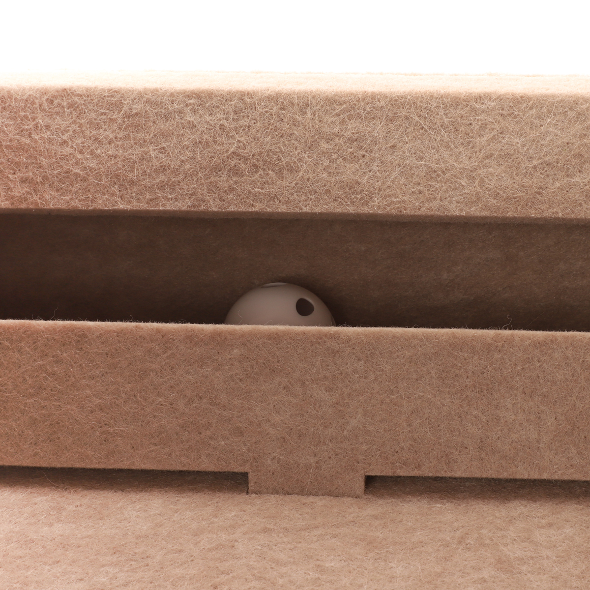 Оригинальный домик не только оживит интерьер, но и порадует вашего питомца. Изделие выполнено из плотного войлока - материала, который одновременно удерживает тепло и хорошо пропускает воздух. Такой домик станет прекрасным местом как для отдыха, так и для игры: в специальные выемки прячутся пластиковые мячики с колокольчиками (в комплекте 2шт.), а "под крышу" подвешивается шарик из сизаля. Сборка изделия - простая и быстрая, при необходимости домик можно разобрать для компактного хранения или транспортировки. Цвет изделия: бежевый. Размер изделия: 440*330*380мм (диаметр шарика из сизаля - 40мм, пластиковых шариков - 30мм).