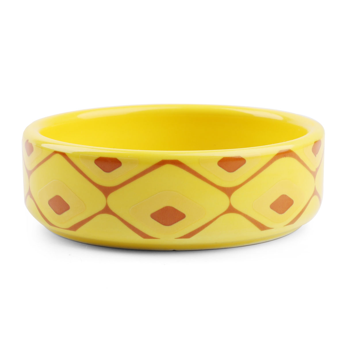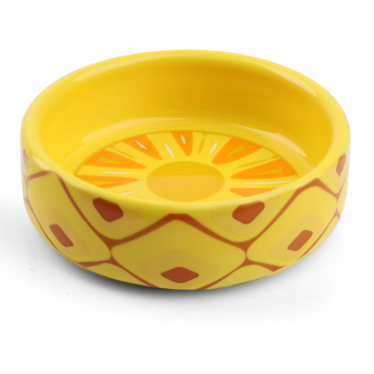 Стильная и функциональная миска для мелких животных выполнена из высококачественной керамики яркой расцветки. Такая миска идеально подойдет как для воды, так и для корма любой консистенции. Она комфортна для питомца и легко моется под струей проточной воды с использованием бытовых моющих средств. А оригинальный "ананасовый" дизайн позволит ей стать украшением любого интерьера. Цвет изделия: жёлтый. Размер изделия: d дна - 75мм; d верхней части - 85мм; высота - 25мм. Объем - 0,1л.