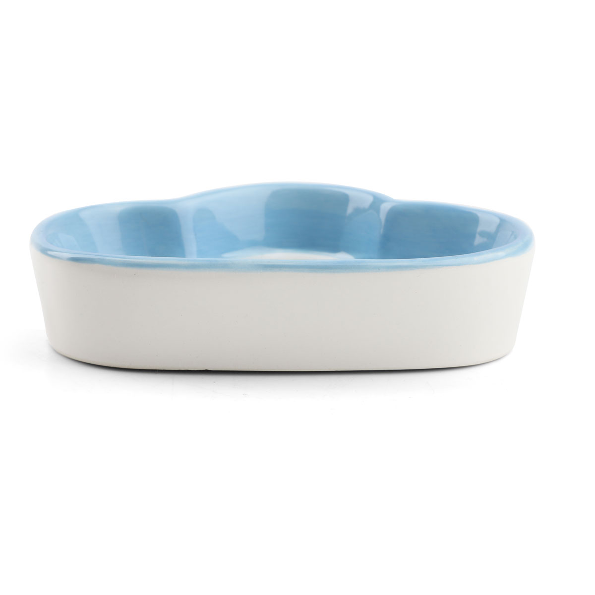 Стильная и функциональная миска для мелких животных выполнена из высококачественной керамики яркой расцветки. Такая миска идеально подойдет как для воды, так и для корма любой консистенции. Она комфортна для питомца и легко моется под струей проточной воды с использованием бытовых моющих средств. А оригинальный дизайн в виде облачка позволит ей стать украшением любого интерьера. Цвет изделия: бело-голубой. Размер изделия: 108*72*25мм (размер по дну: 100*70мм). Объем - 0,1л.